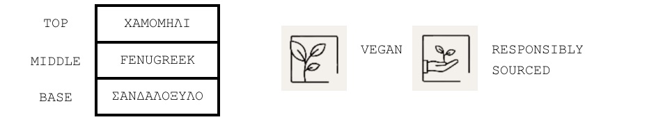 Το μοναδικό άρωμα Fenugreek & Chamomile, είναι ένα μαγευτικό μείγμα εμπνευσμένο από την ουσία της Ελλάδας και του Μεξικού. Φανταστείτε τον εαυτό σας ανάμεσα σε χωράφια με χαμομήλι στην Ελλάδα και απολαμβάνοντας την τροπική γοητεία της καρύδας στο Μεξικό. Καθώς η λεβάντα, το φασκόμηλο και ο τριγωνέλλας πλέκουν τη μαγεία τους και η ζεστασιά του σανταλόξυλου και του γρασιδιού εδραιώνουν το άρωμα, νιώστε να μεταφέρεστε σε ένα μέρος όπου η ηρεμία συναντά τη ζωτικότητα και οι πολιτισμοί συμπλέκονται αρμονικά.