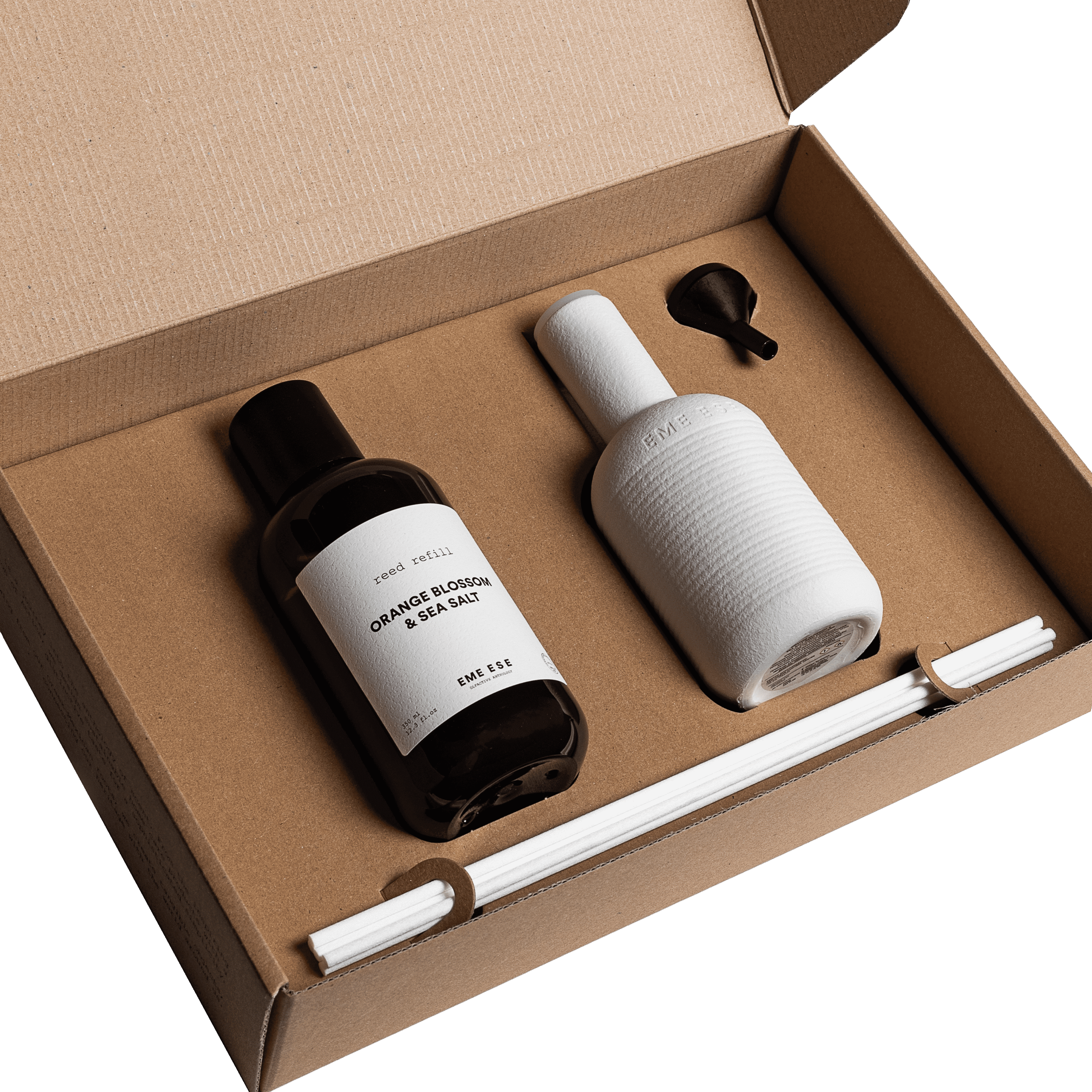 Κασετίνα: Μέσα στη συσκευασία σας, θα βρείτε όλα όσα χρειάζεστε για να δημιουργήσετε τη δική σας οσφρητική όαση. Βγάλτε τον κεραμικό περιέκτη (reed diffuser), το υγρό άρωμα και το μικροσκοπικό αλλά πανίσχυρο χωνί.