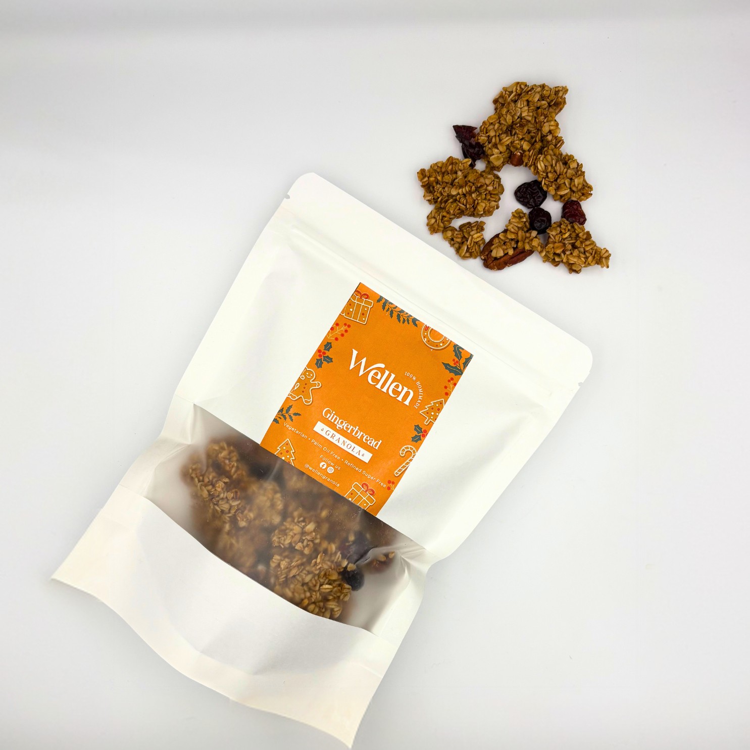 Νιφάδες βρώμης, ελληνικό μέλι, λάδι καρύδας, τζίντζερ, μοσχοκάρυδο, κανέλλα, γαρύφαλλο, καρύδια πεκάν, αποξηραμένο κράνμπερι χωρίς ζάχαρη, χοντρό αλάτι