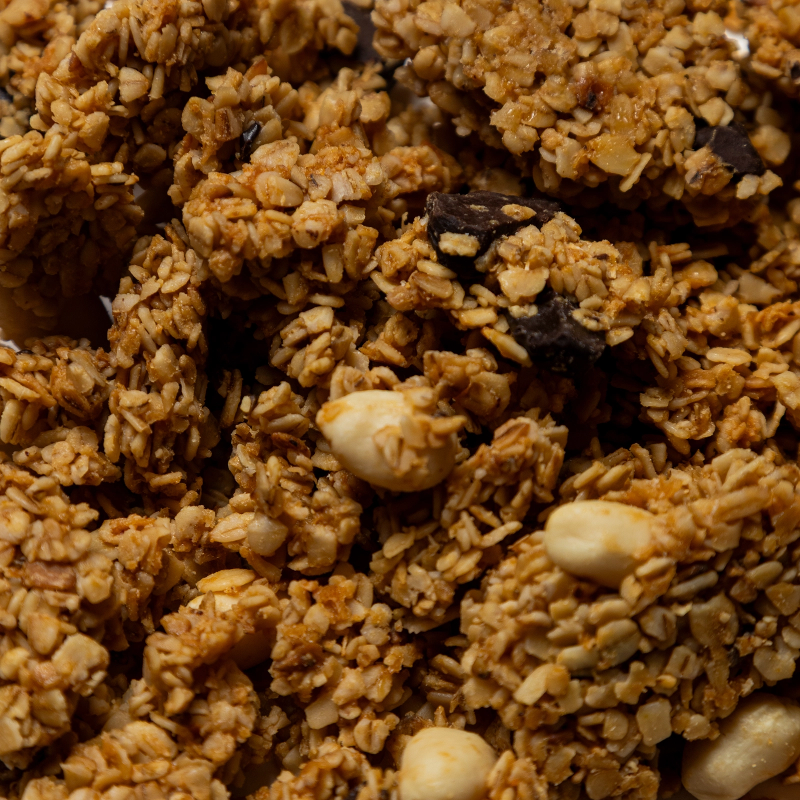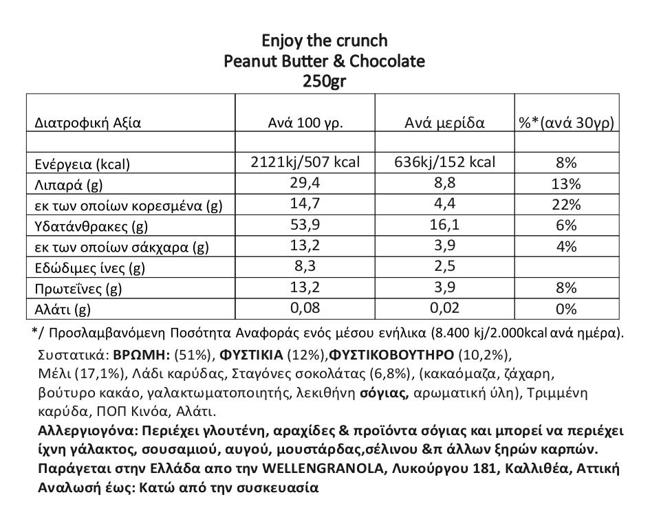 Νιφάδες βρώμης, ελληνικό μέλι, λάδι καρύδας, ινδοκάρυδο, φυστικοβούτυρο, σοκολάτα υγείας με στέβια, αράπικο φυστίκι, χοντρό αλάτι